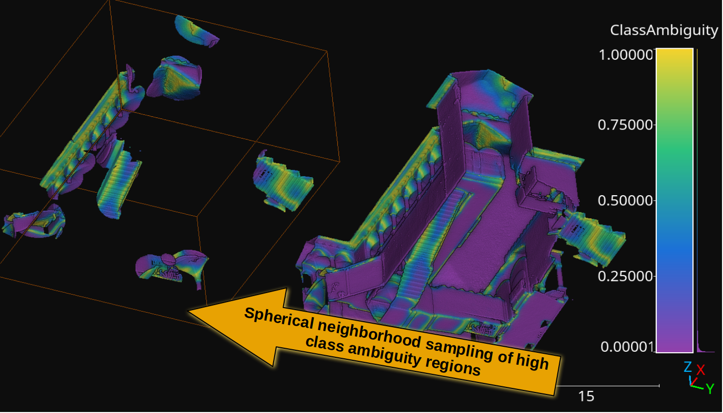 A point cloud is generated by sampling spherical neighborhoods from high class ambiguity regions in the original point cloud. The class ambiguity has been measured for a KPConv-like neural network model. The point cloud is taken from the Architectural Cultural Heritage (ArCH) dataset .